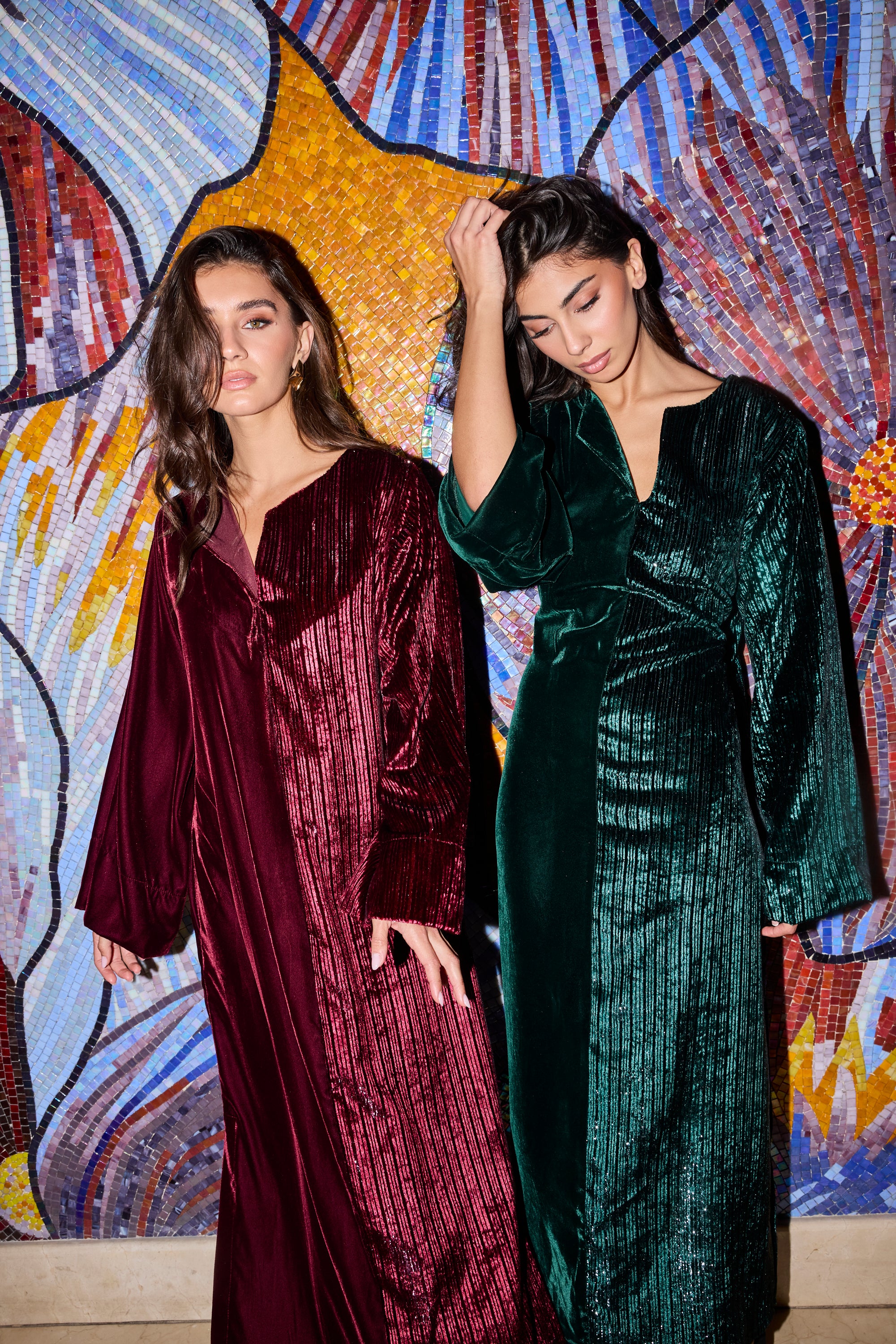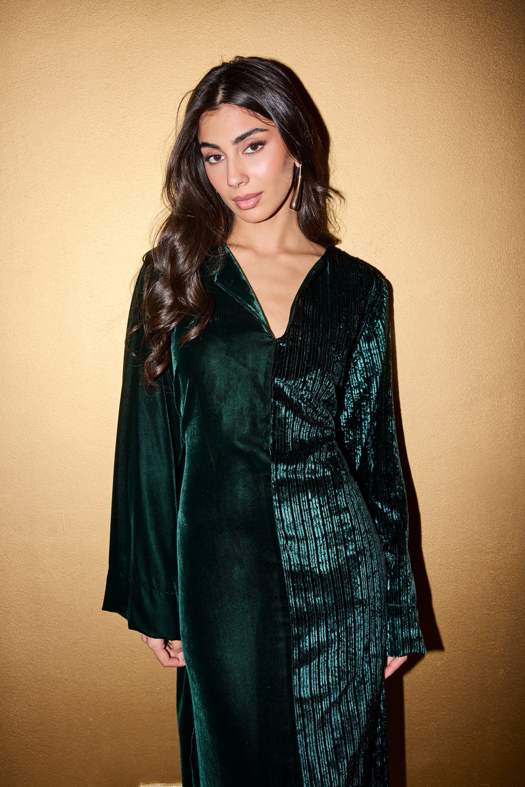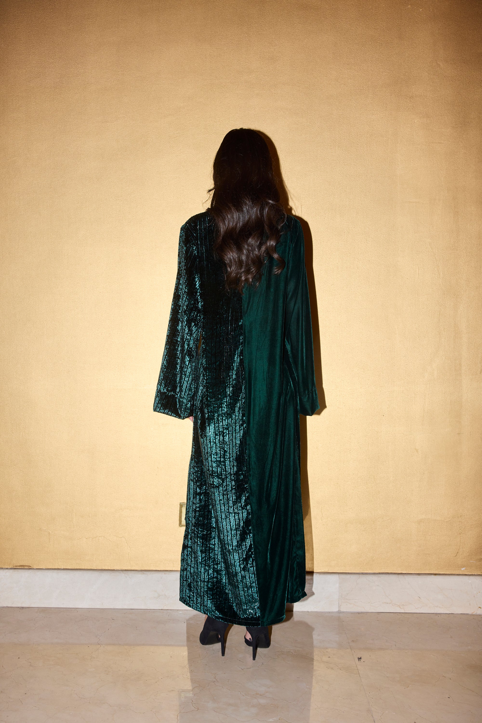 Introducing Yara, the perfect addition to any wardrobe. This half and half kaftan offers an effortless and elegant style, with one side featuring a sleek shimmer and the other a simple yet chic design. Easy to wear and versatile, this kaftan is a must-have in your closet. Comes with a hidden belt, can be worn tied for a more fitted look, or let loose for a more relaxed look.Â