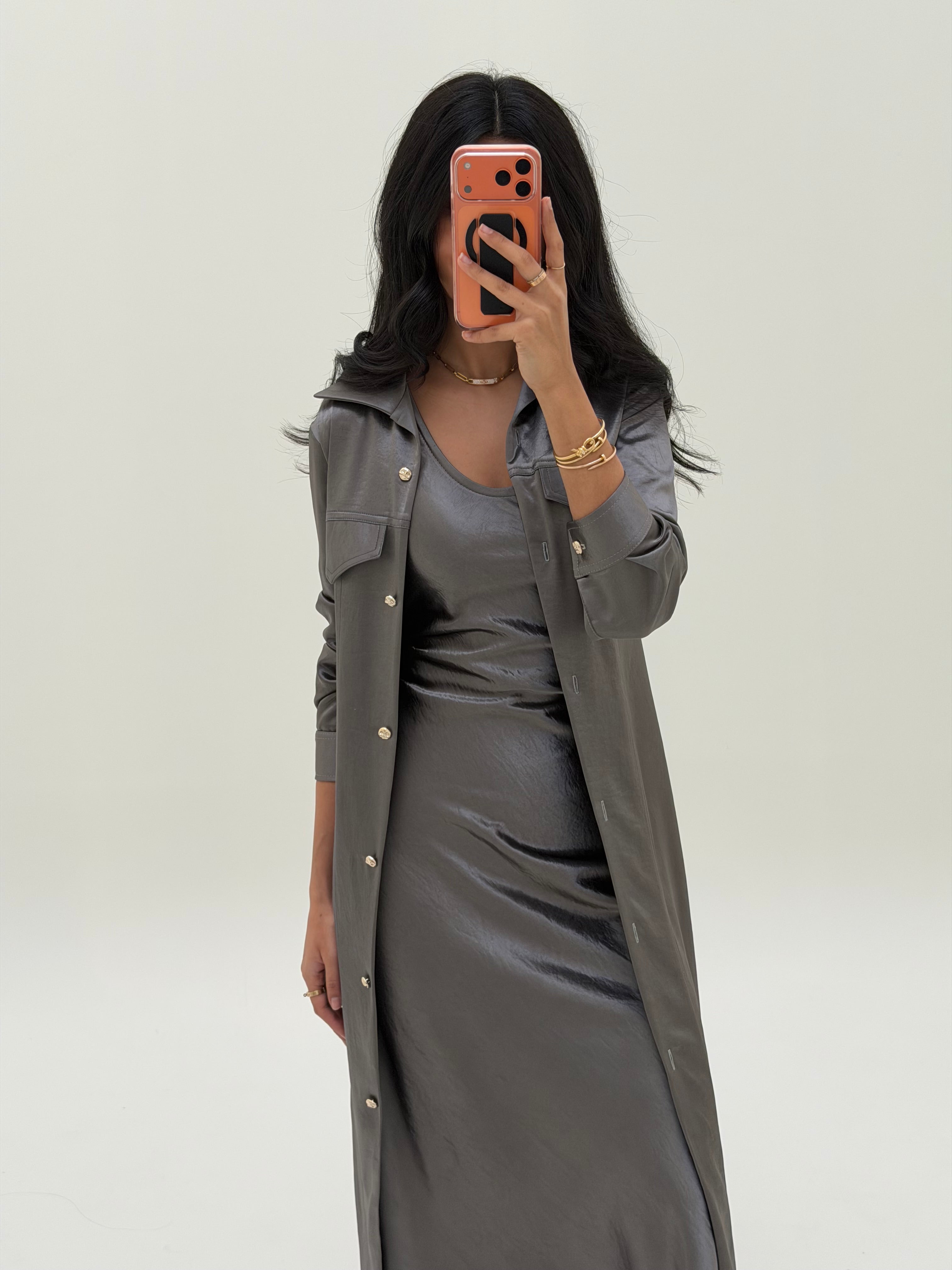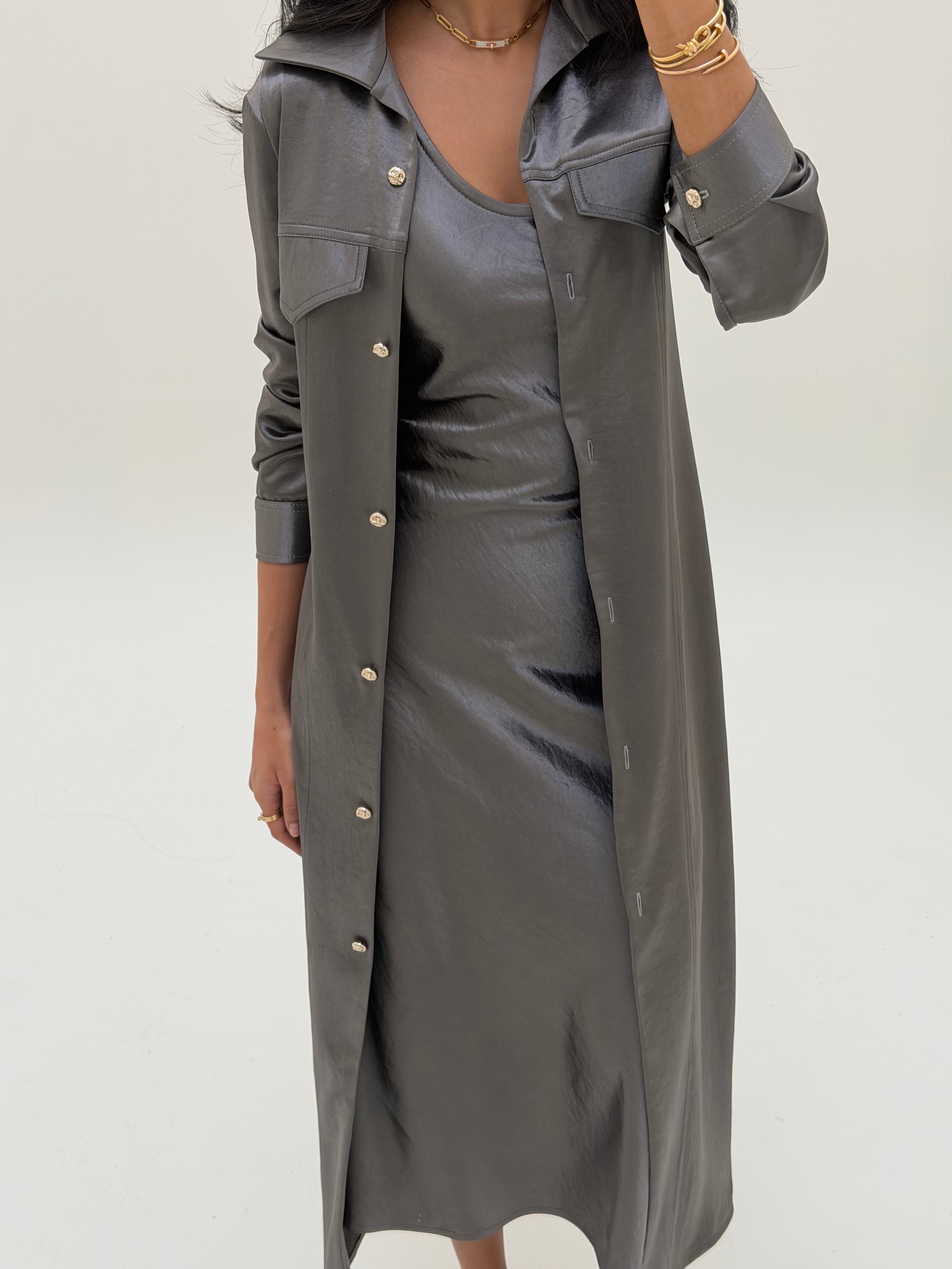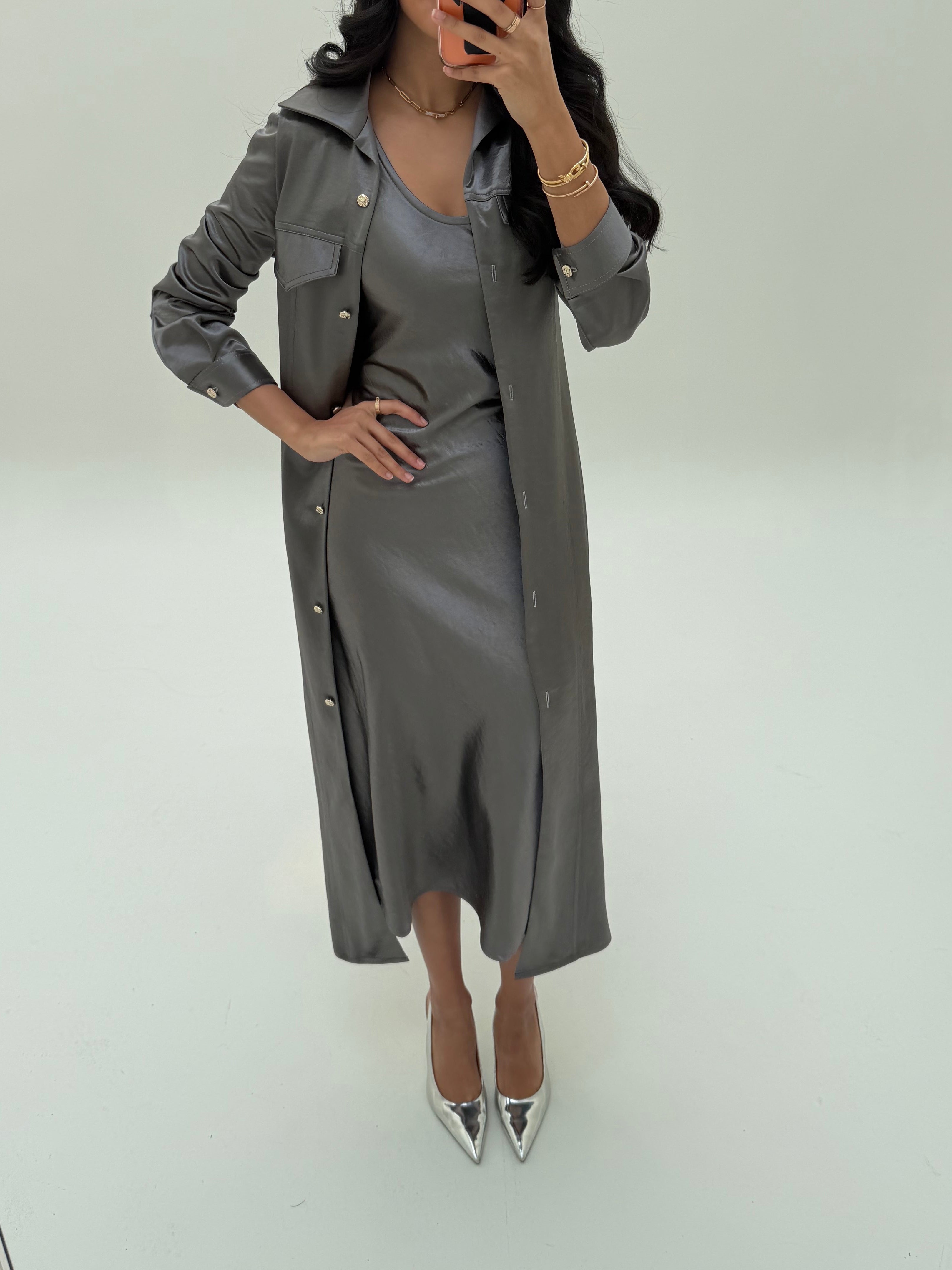 Refined and versatile, this silk dress is styled with a lightweight jacket for a polished, layered look.